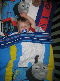 July 29, 2010 - Noah's toddler bed is now complete with Thomas the Train bedding. He loves it!!!